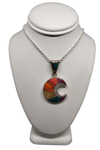 Este dije tiene la forma de una elegante luna creciente, símbolo de los ciclos de la vida, los misterios nocturnos y la renovación. En su interior, el diseño incorpora patrones geométricos y formas coloridas estilizadas inspiradas en las Líneas de Nazca, los famosos geoglifos del antiguo Perú, conocidos por su misticismo y su posible conexión con lo divino y lo astronómico.